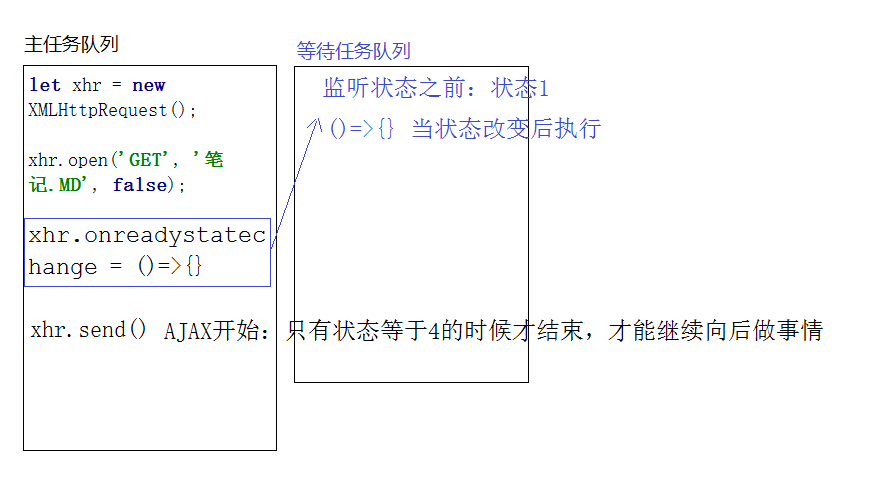 - 发送 AJAX 请求: 从这步开始, 当前 AJAX 任务开始, 如果 AJAX 是同步的, 后续代码不会执行, 要等到 AJAX 状态成功后再执行, 反之异步不会